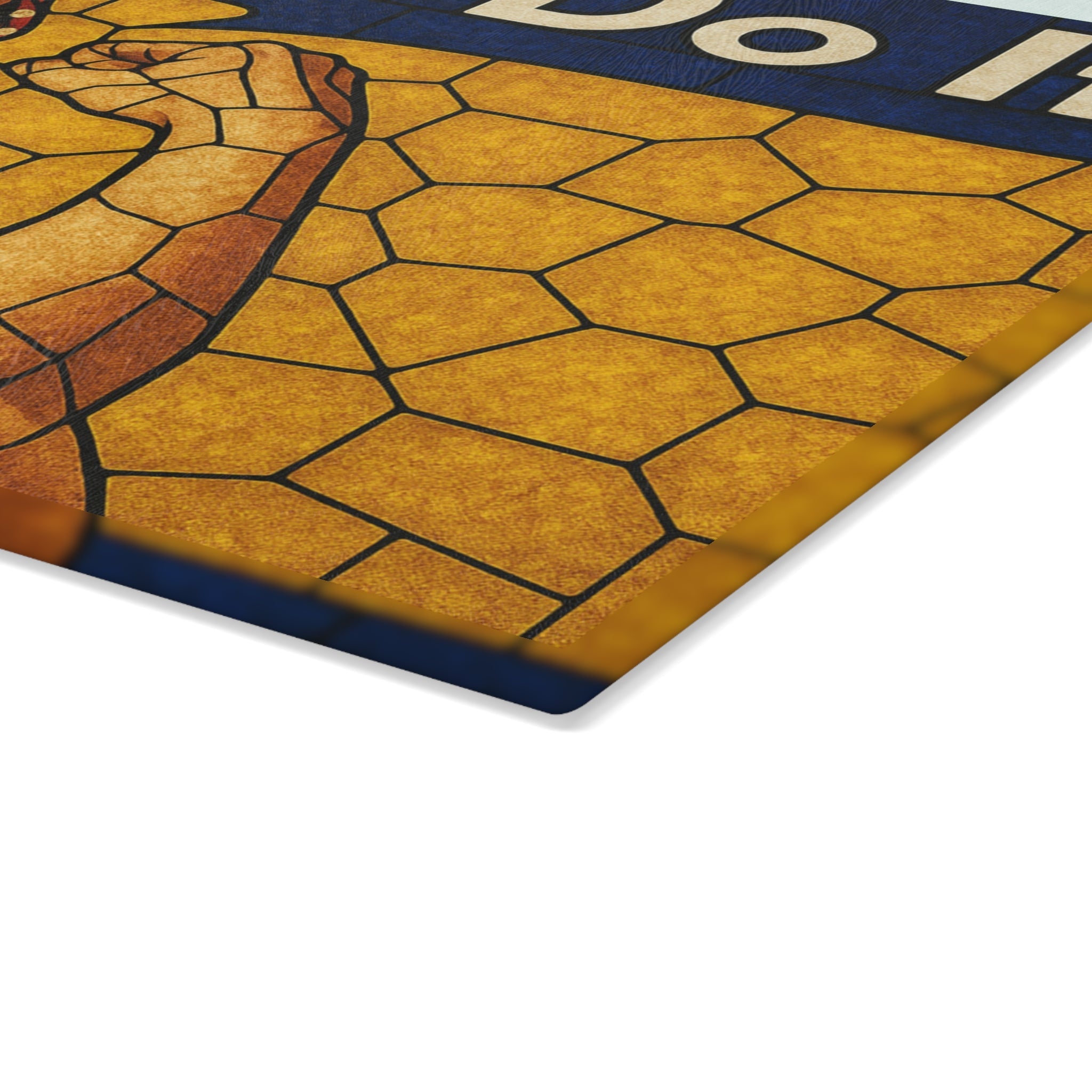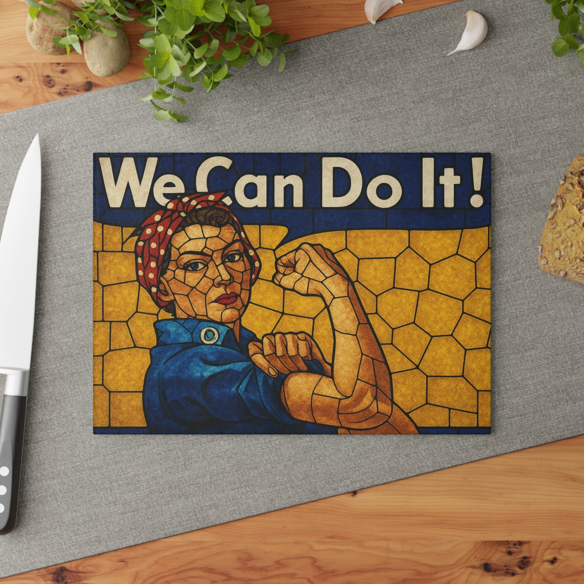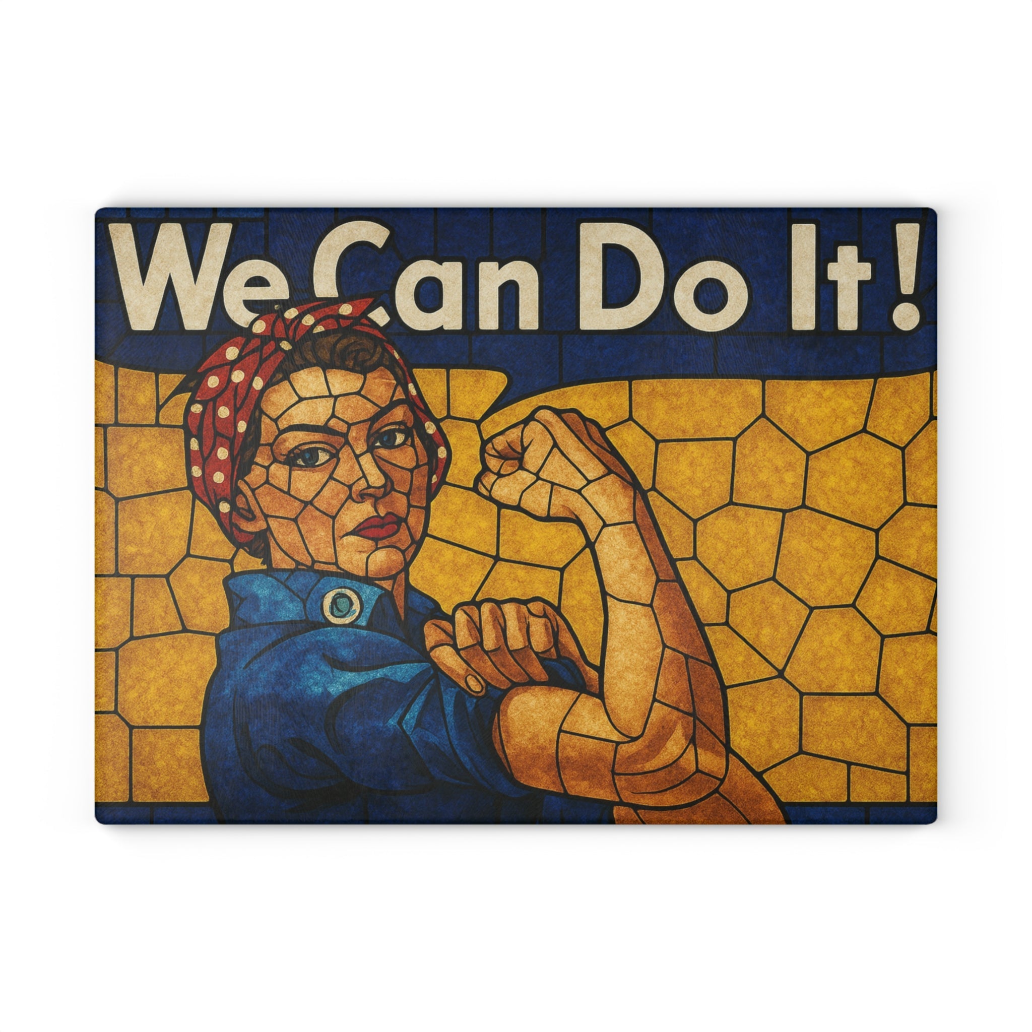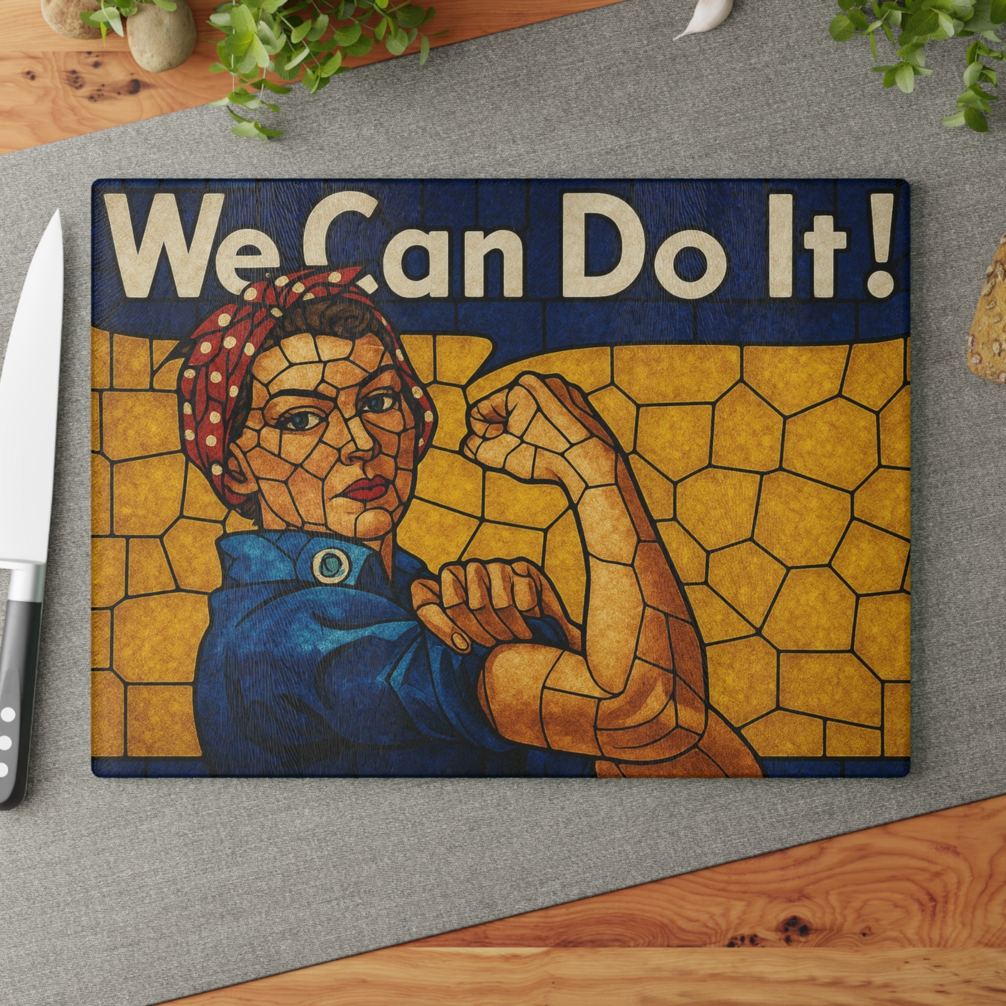 Add strength, style, and a dose of history to your kitchen with our Stained Glass Rosie the Riveter Glass Cutting Board. This striking piece is more than just a kitchen essential—it's a bold statement of empowerment. Featuring a vivid stained glass design of Rosie the Riveter, the iconic World War II symbol of American resilience and can-do spirit, this board turns meal prep into an inspiring experience.