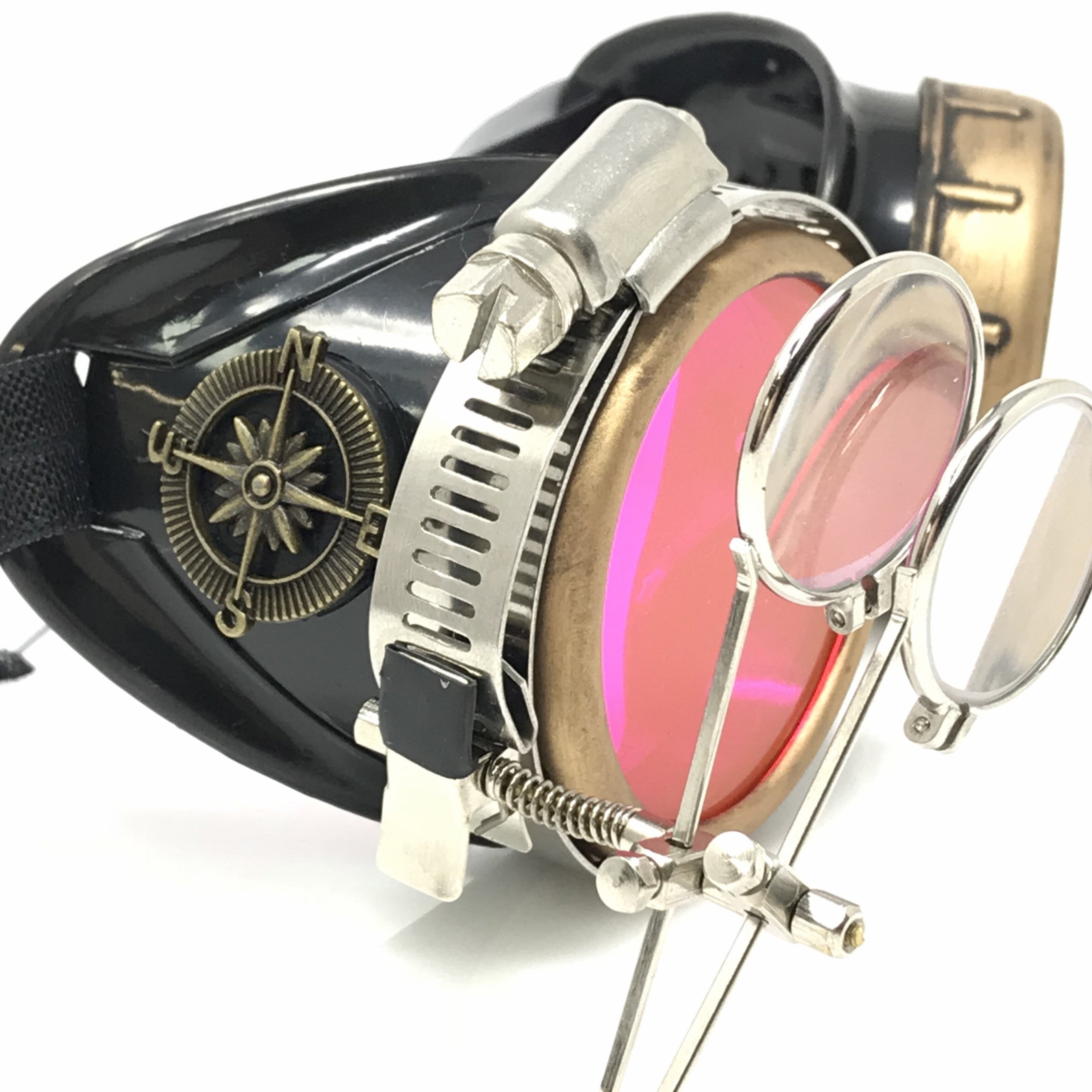 Steampunk Goggles with magnifying loupes UV glow neon pink lenses