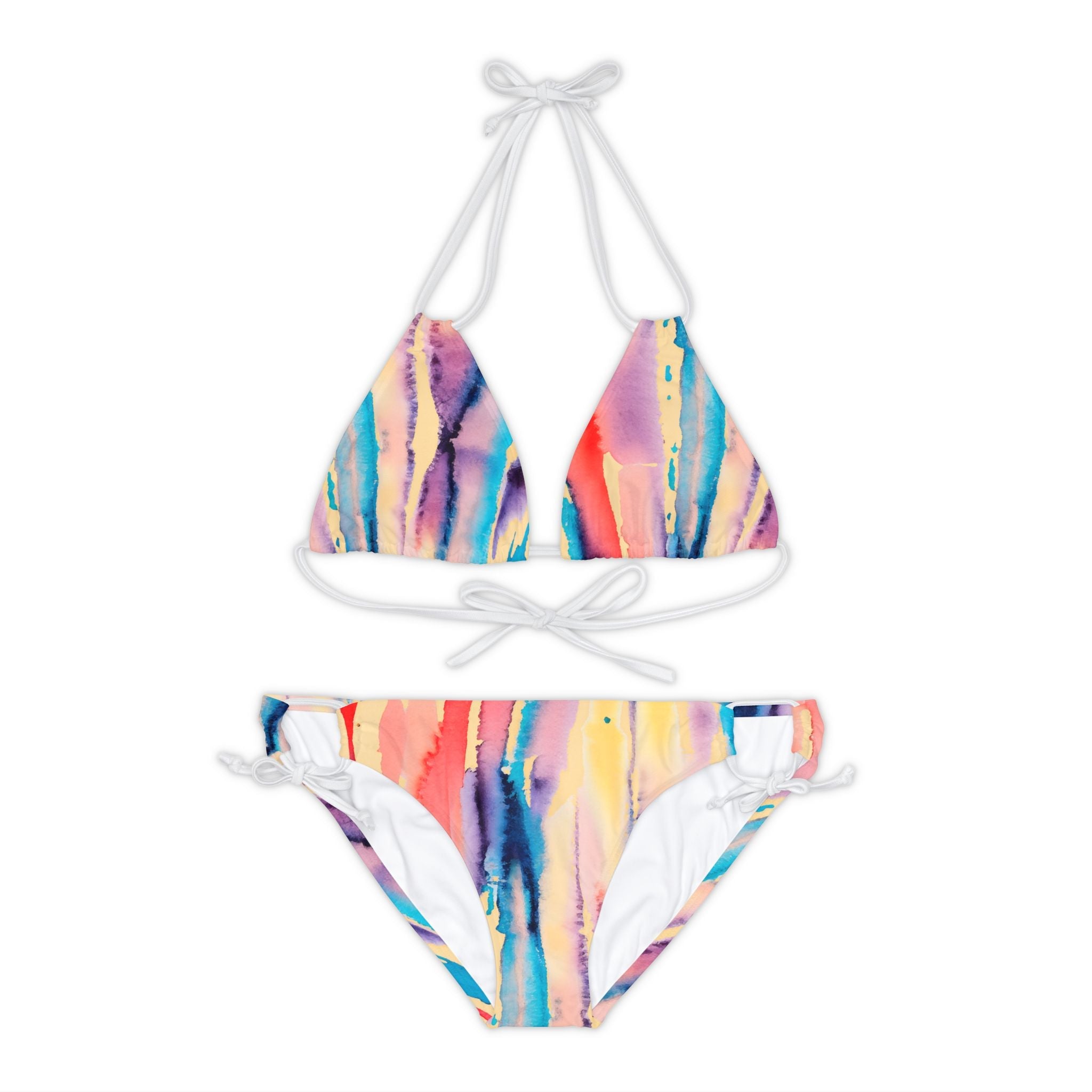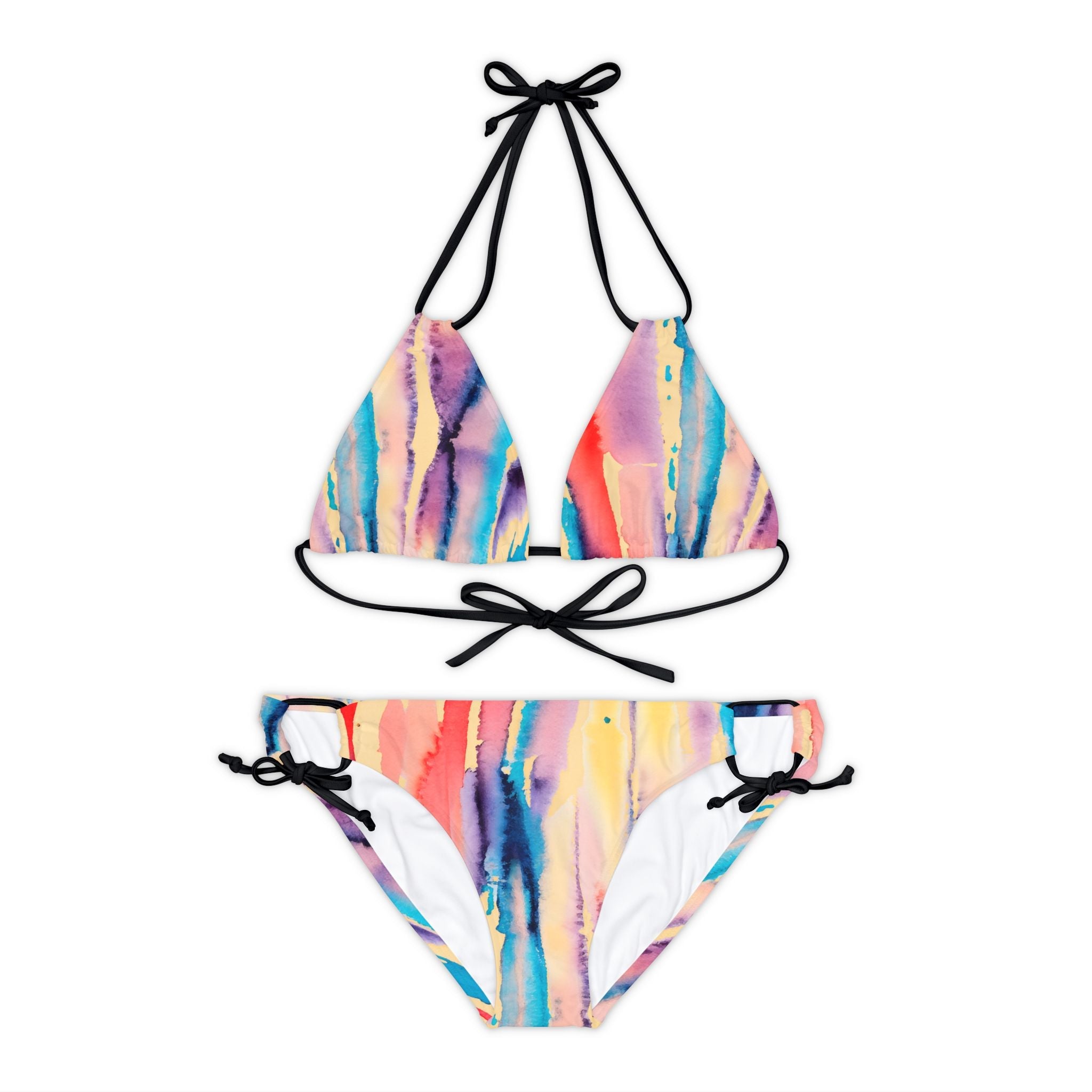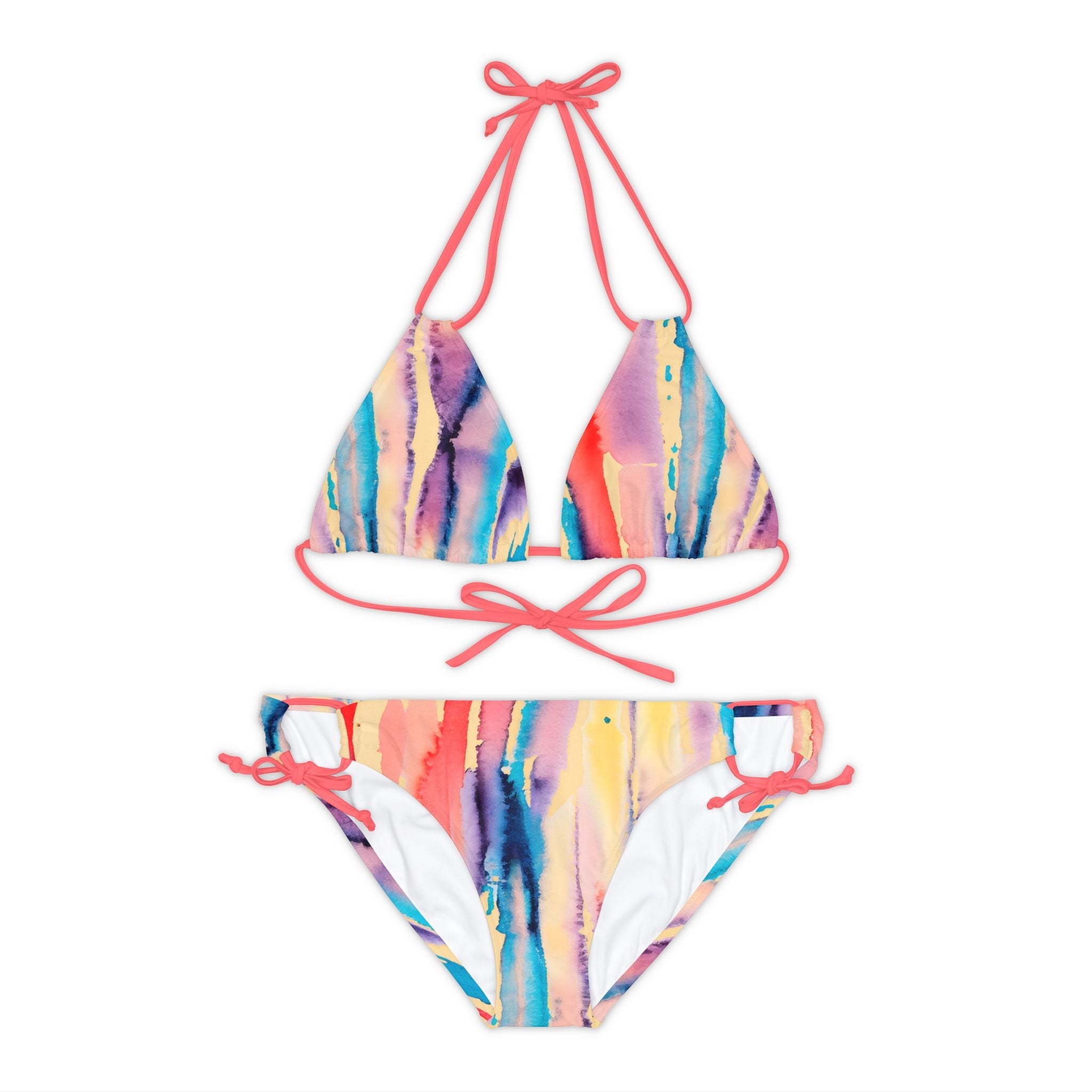 This strappy bikini set is crafted from 4-way stretch Tricot, composed of 82% Microfiber and 18% Spandex, making it the ideal choice for all your summer adventures. Featuring adjustable elastic straps for a perfect fit, this complete two-piece swimsuit is ready for your custom art to turn it into an instant summer favorite.