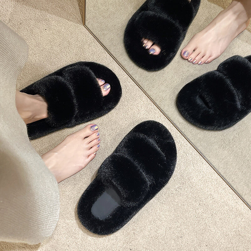 When you first receive the slippers, the fur may have been flattened due to transportation. Brush the fur and use a hairdryer to fluff it up.
