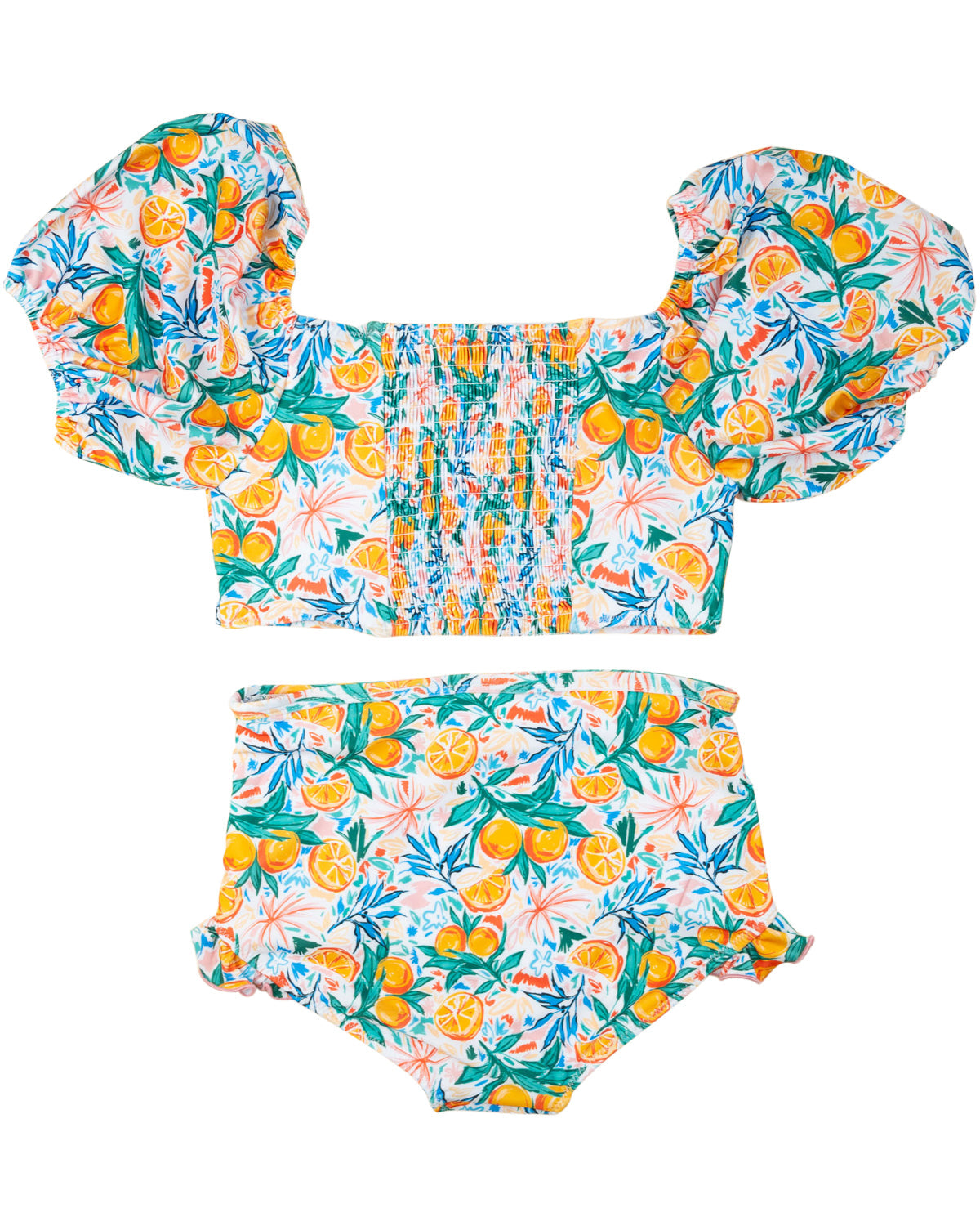 Sunny days call for the sweetest swimwear! Our Summer Citrus High Waisted Bikini is made for little ones who love to splash and play in style. The puff-sleeve top features a charming smocked back for a comfy, flexible fit, while the high-waisted bottoms keep things secure for all-day fun. With a bright citrus print and the cutest ruffle details, this set is a summertime dream!