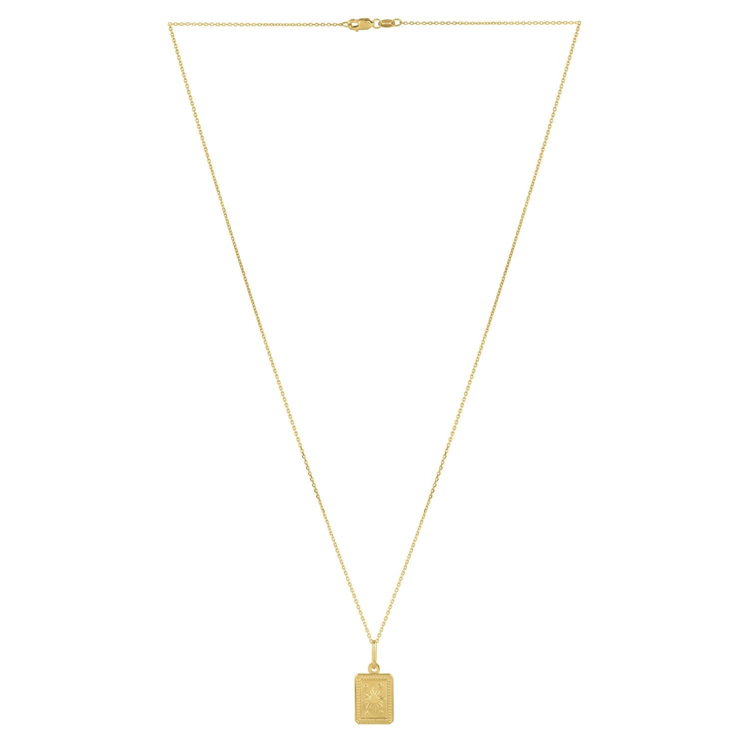 Radiating warmth, this 14k yellow gold rectangle sun & stars pendant celebrates the celestial dance of day and night. Featuring a glowing sun surrounded by shimmering stars and an intricate border, its sleek rectangular frame is enhanced with a polished finish for timeless shine. This pendant, paired with an 18 inches chain, brings a touch of brilliance to your every look. Secured with a lobster clasp closure.
