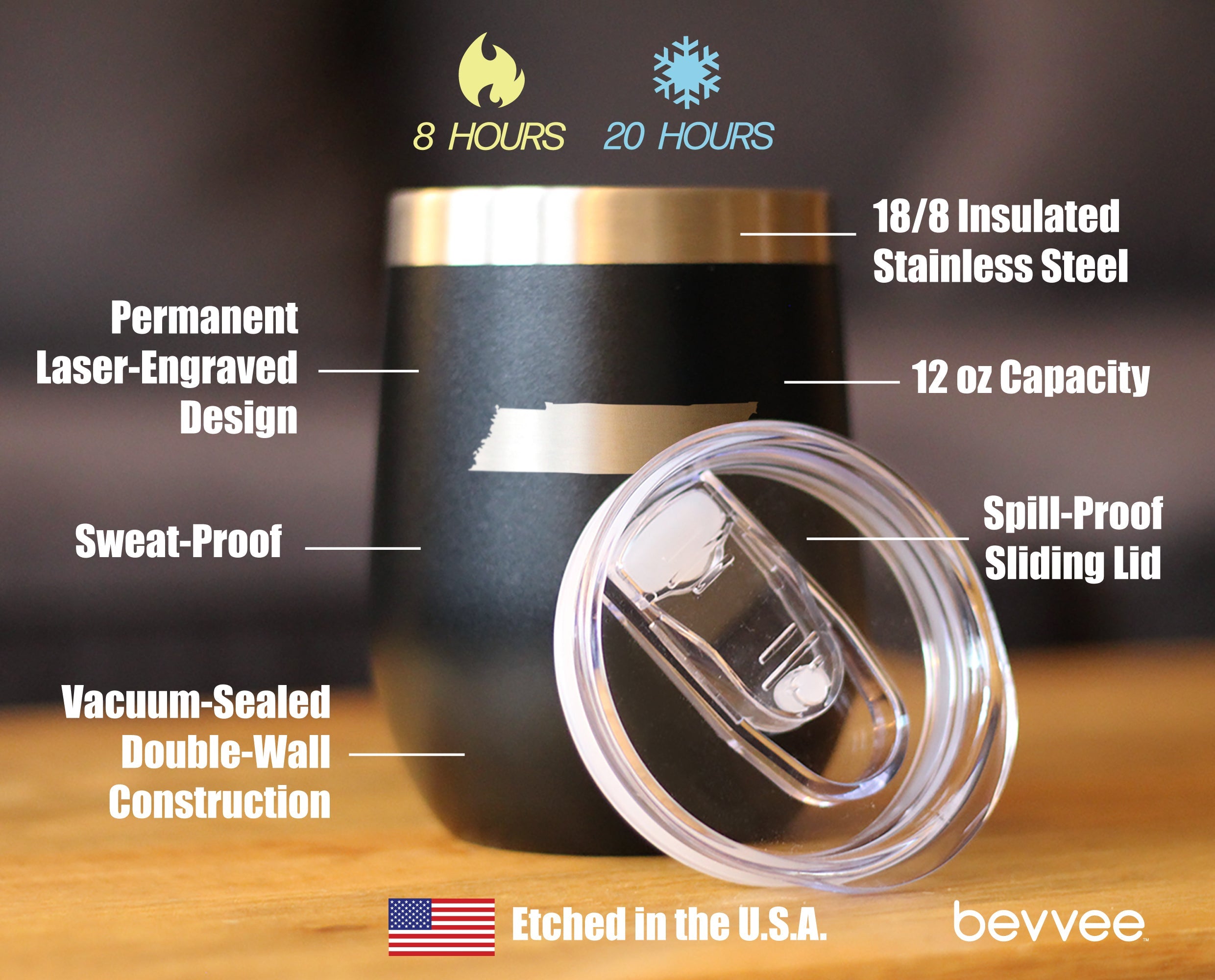 Our 12oz. stemless wine tumblers with sliding lids feature stainless steel double-wall construction, vacuum insulated for 2X cold and heat retention compared to glass or plastic containers! Etched in America.