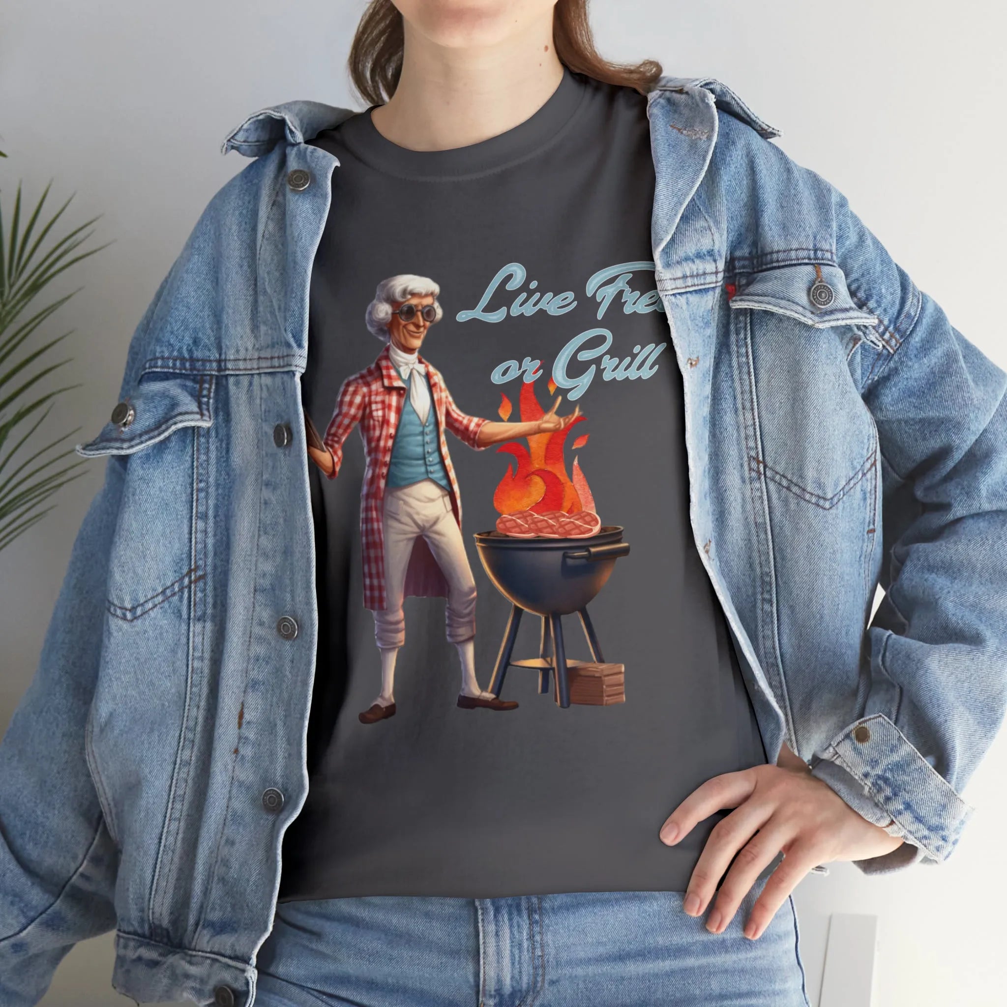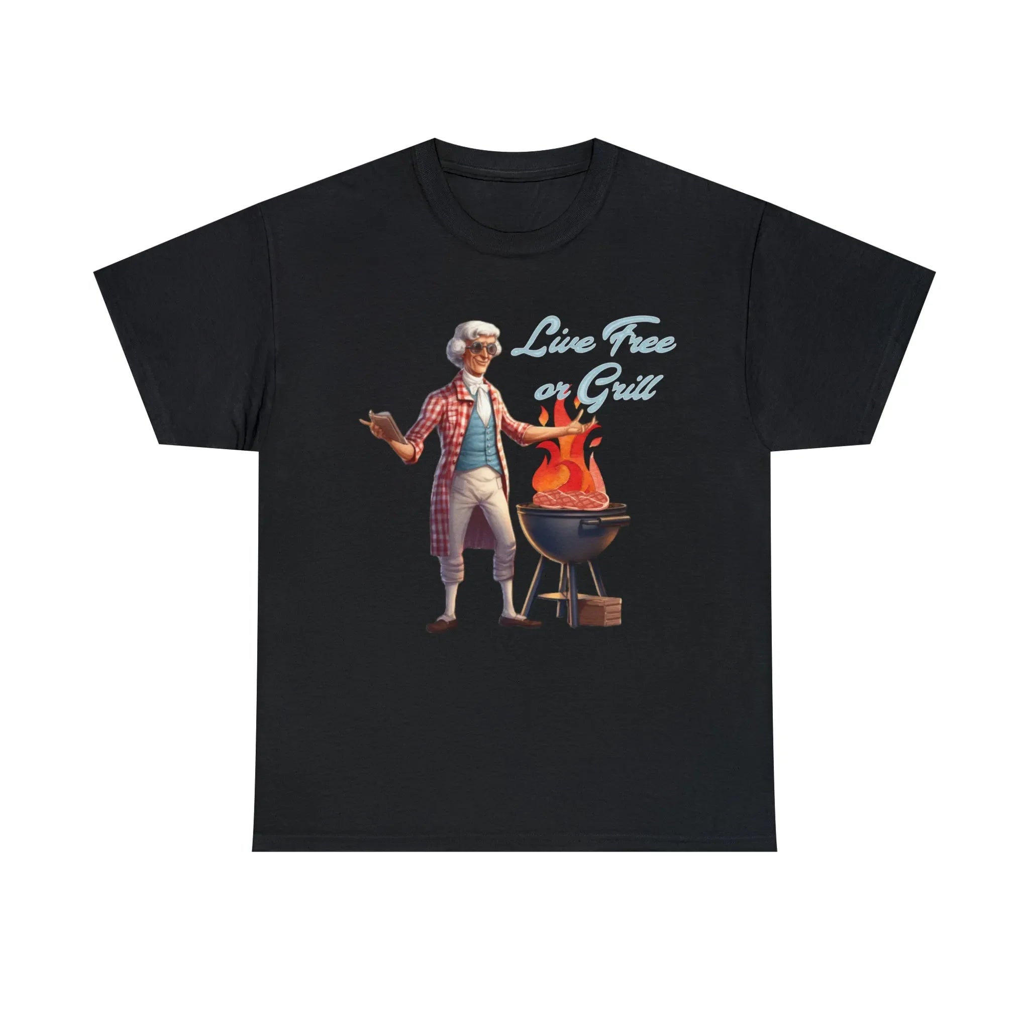 Introducing our iconic "Live Free or Grill" T-Shirt, where history and barbecue unite in a bold and patriotic statement. This unique design showcases none other than Thomas Jefferson himself, the founding father who championed freedom and the pursuit of happiness, engaging in the art of grilling.