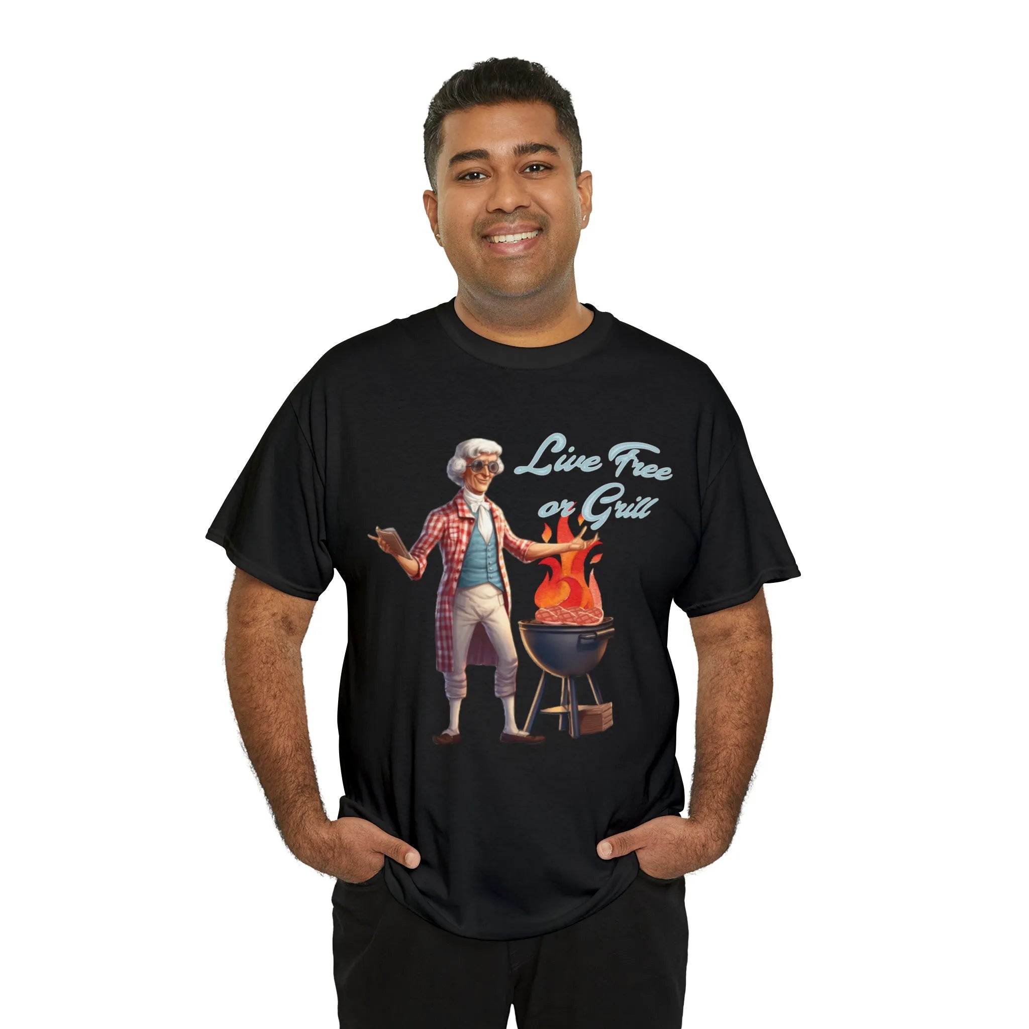 The "Live Free or Grill" T-Shirt with Thomas Jefferson grilling is available in a range of sizes to suit everyone. It makes a fantastic gift for history enthusiasts, barbecue aficionados, or anyone who embraces the American spirit. So, get ready to make a statement, stand out from the crowd, and wear a piece of history with pride.