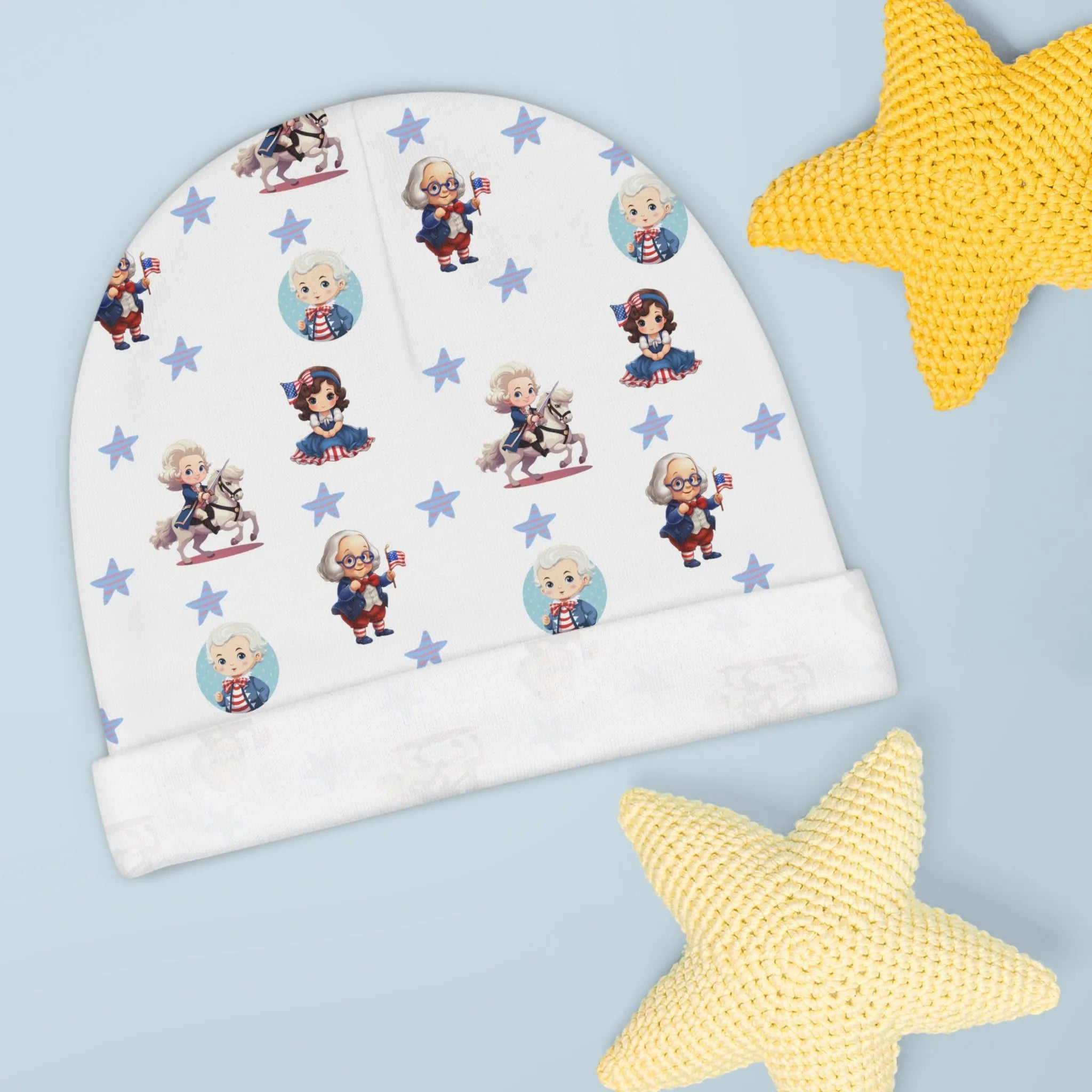 Introducing our charming baby beanie, a whimsical collage of stars and adorable baby versions of historical icons! This cozy beanie features a delightful collage that includes baby Betsy Ross, Thomas Jefferson, George Washington, and Ben Franklin. Each baby character is depicted with irresistible cuteness, surrounded by twinkling stars that symbolize their future greatness. Crafted with love and care, this beanie offers both warmth and style for your little one. Let your baby's head stay snug and adorable as they embark on playful adventures, wearing this enchanting beanie. Inspire dreams of patriotism and admiration with our delightful baby beanie, where stars and historical cuteness unite! Sized for infants up to roughly 6 months old.
