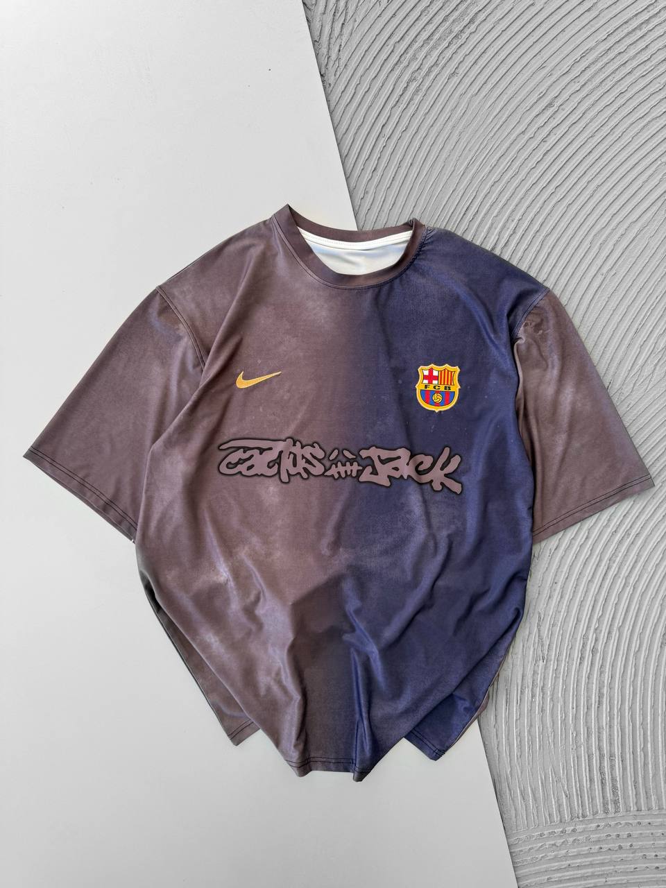 - Bold Graphics: Showcases prominent Cactus Jack and FC Barcelona logos with a unique, distressed aesthetic.