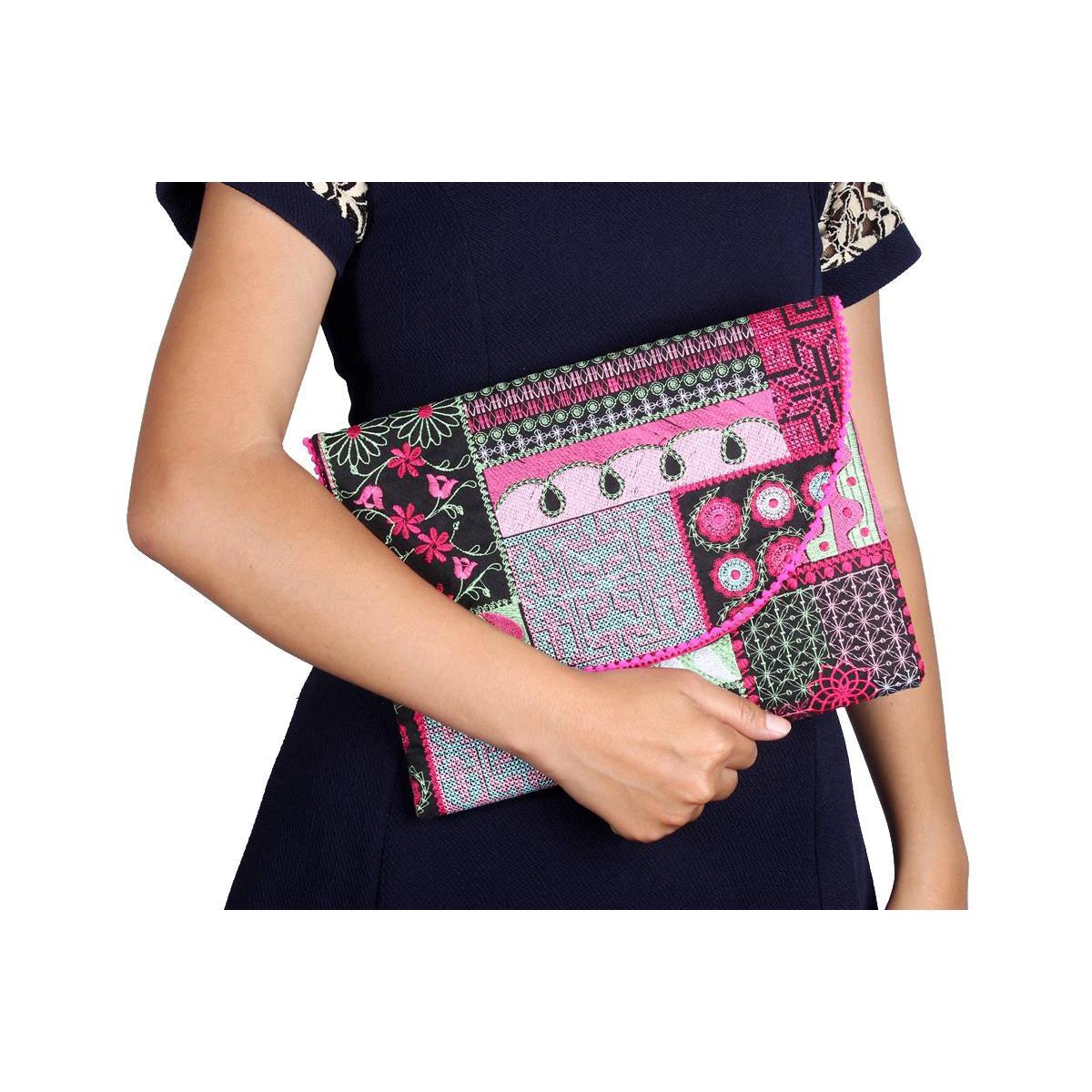Created from gorgeous embroidery in contrasting hues and finished with a tiny pompom trim. Our envelope clutch is lined inside with a zippered inside pocket. Perfect to use with a tablet / iPad or for a night out!