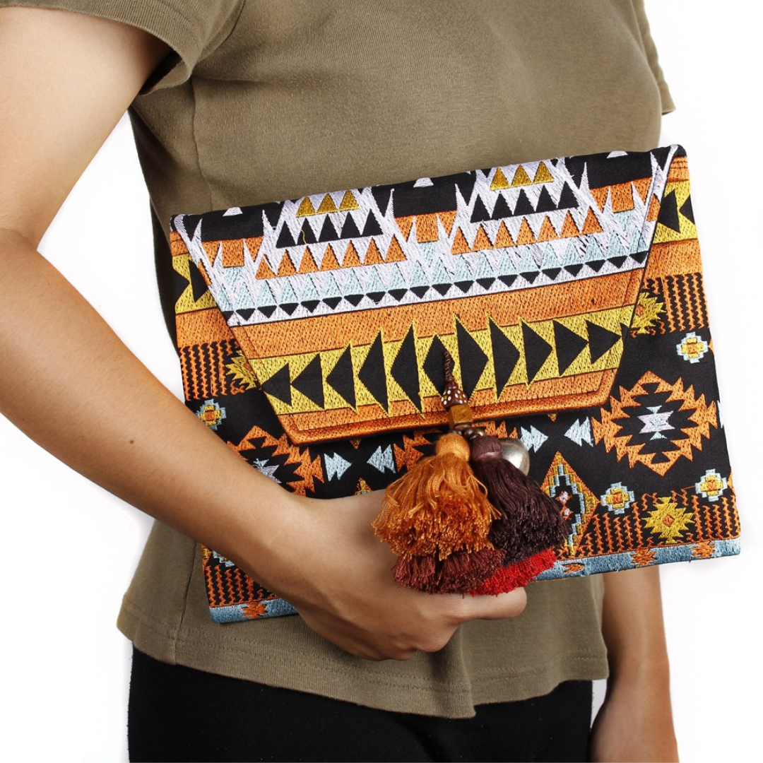 This boho style women's clutch is ethically handmade by women artisans in Thailand. It features an embroidered geometric pattern black cotton lining, adorned with orange-red-brown beaded tassels and bells
