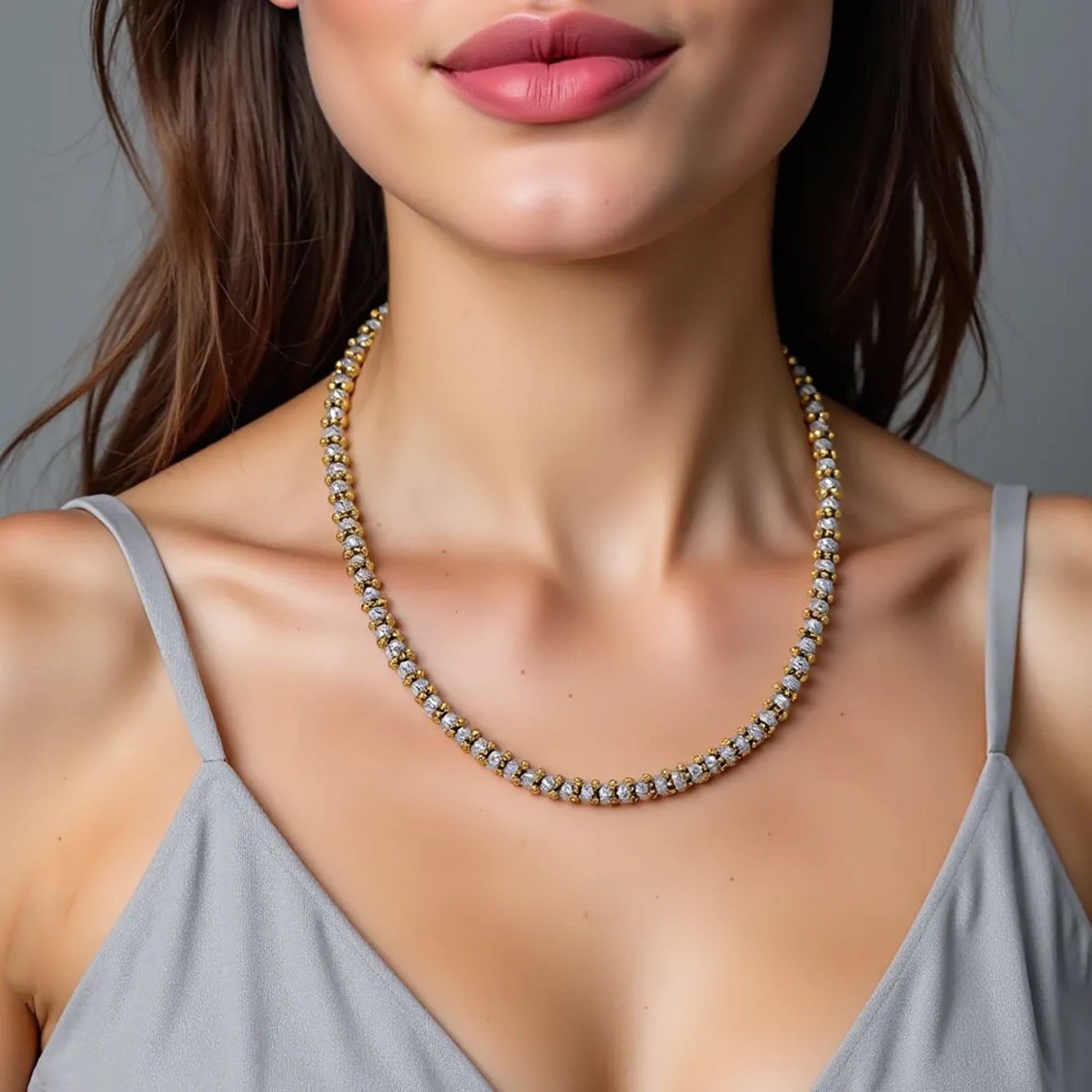 Delicate gold spacers set between textured silver beads define this 14K two-tone fancy chain necklace. A lobster clasp provides a secure fit, while the interplay of metals creates a balanced aesthetic. Designed for versatility, it offers a refined accent whether worn alone or layered with other pieces.