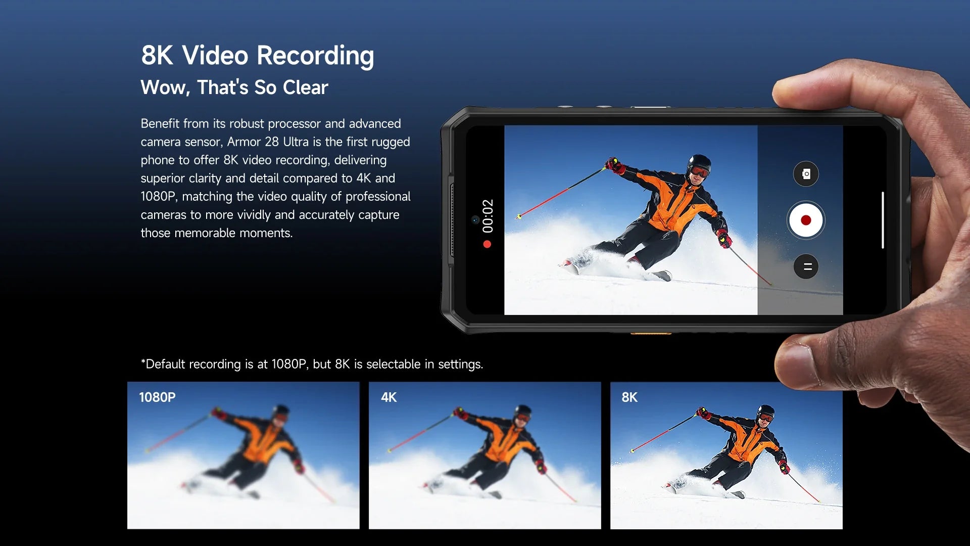 Benefit from its robust processor and advanced camera sensor, Armor 28 Ultra is the first rugged phone to offer 8K video recording, delivering superior clarity and detail compared to 4K and 1080P, matching the video quality of professional cameras to more vividly and accurately capture those memorable moments.