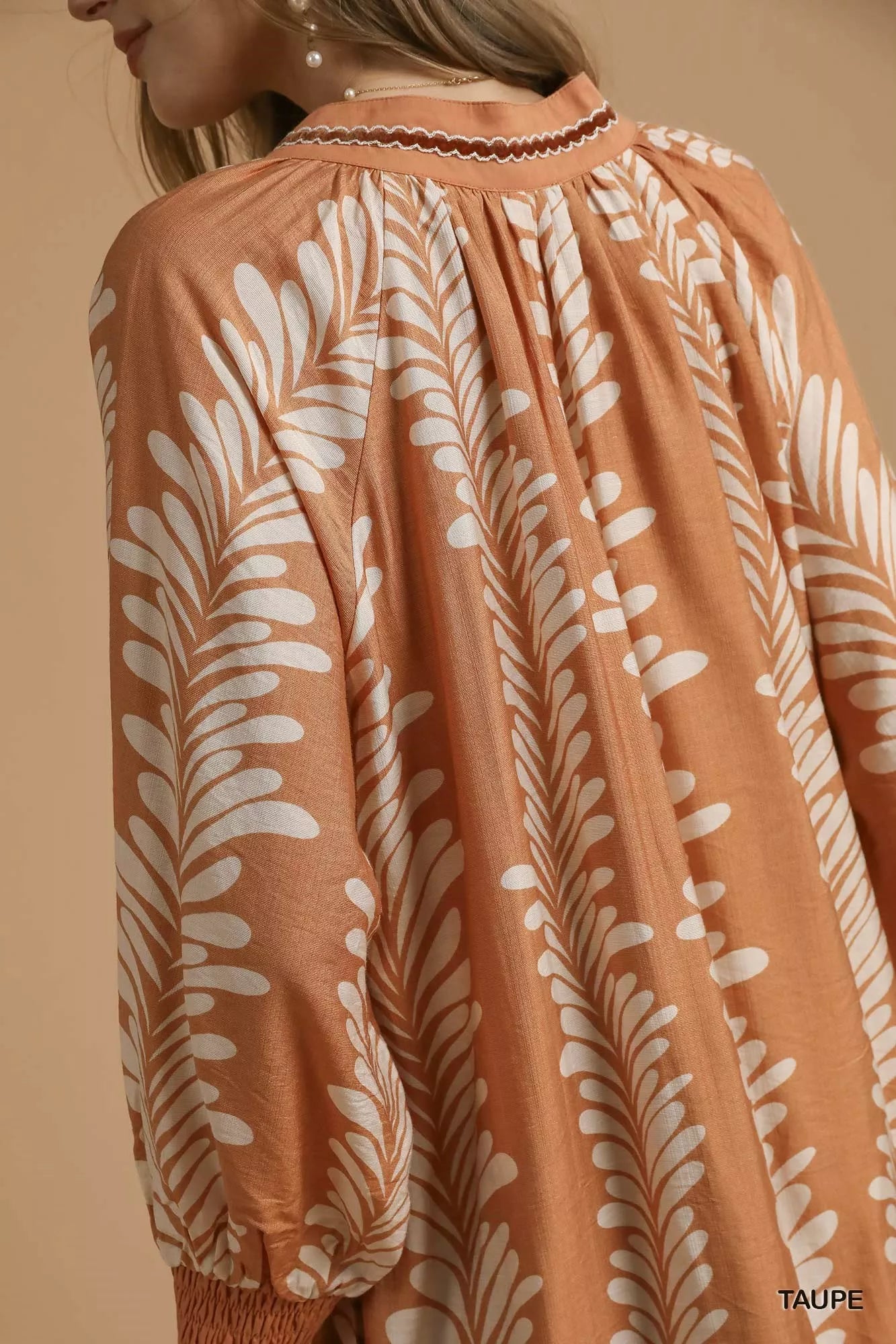 Umgee Leaf Print Notched Mini Babydoll Dress ‐ TAUPE / M