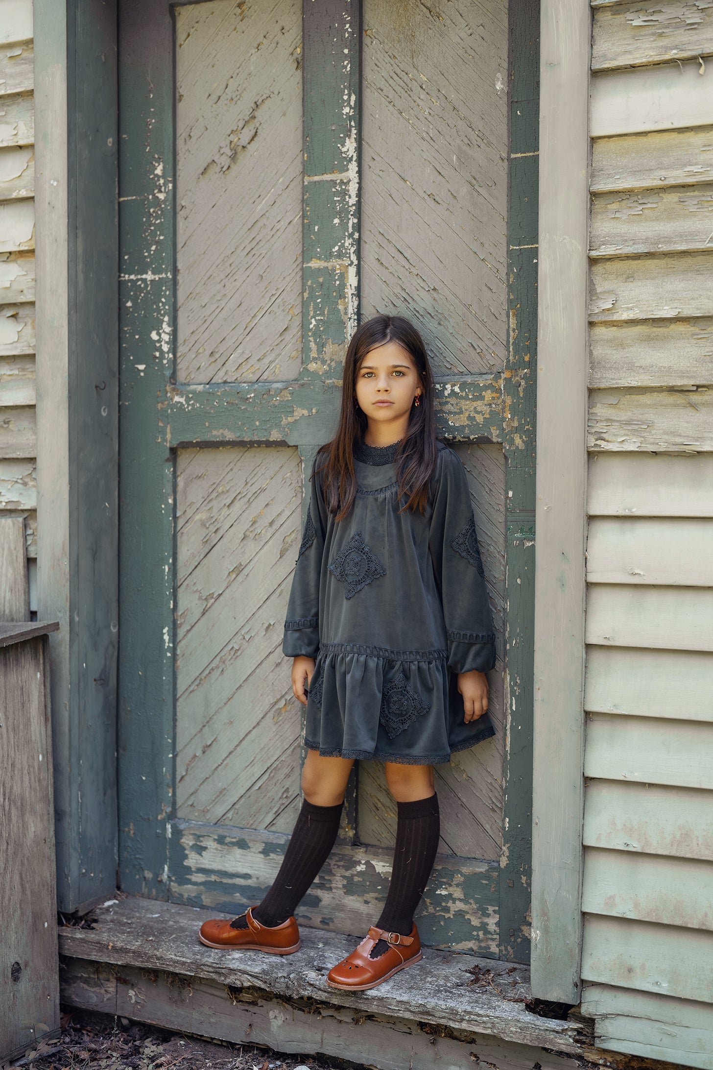 Girls velvet dress with lace neckline, elastic at cuffs and center back invisible zipper opening. ֲ