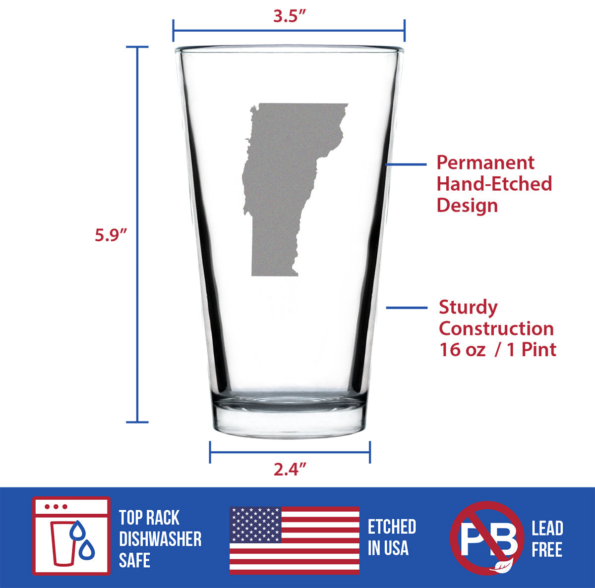 Vermont State Outline Pint Glass for Beer - State Themed Drinking Decor and Gifts for Vermonter Women & Men - 16 Oz Glasses