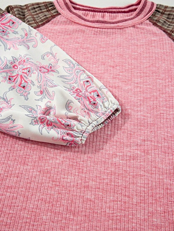 Viscose Plaid Floral Patchwork Raglan Ribbed Top