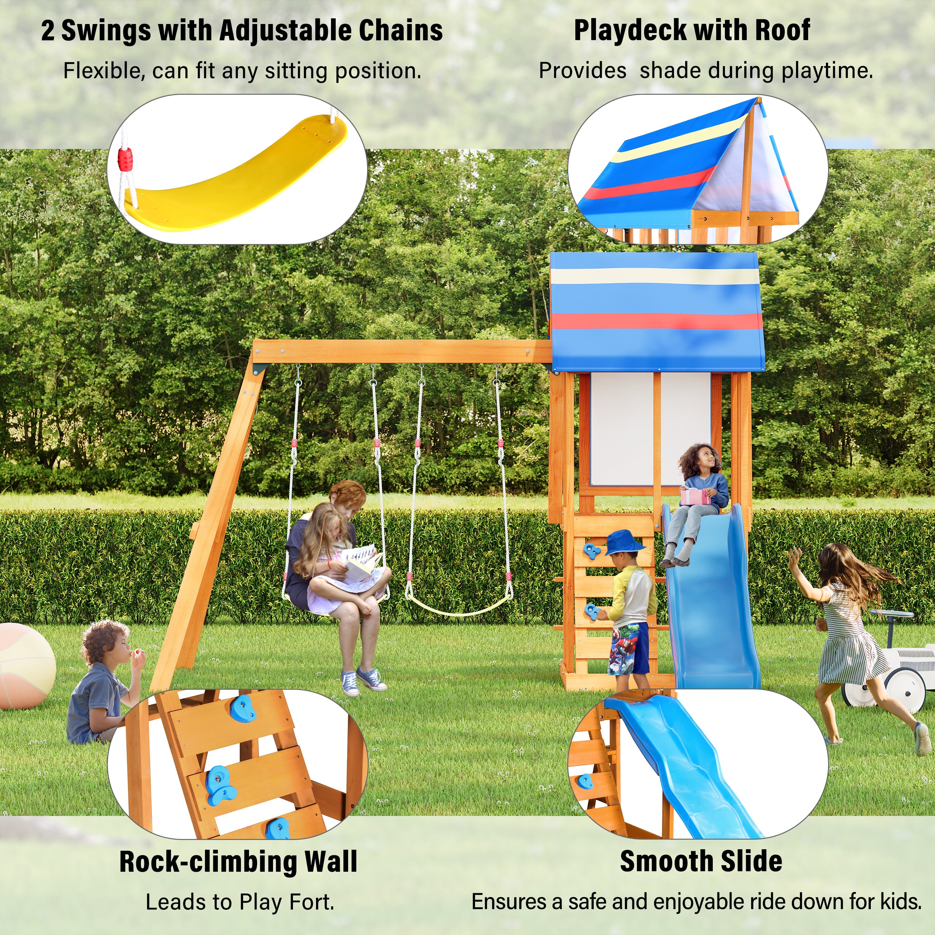 This outdoor children's playset is crafted from durable cedarwood, offering long-lasting performance and natural resistance to the elements. Featuring a sturdy A-frame structure for added stability, it ensures safety and security during play. The set includes a slide, two swings with adjustable heights, and a rock-climbing wall, providing versatile play options that encourage physical activity and imaginative fun for kids of all ages. Designed for comfort, the slide has smooth edges and a gentle slope, while the swings offer adjustable ropes for a stable experience. Perfect for any garden, backyard, or playground, this weather-resistant playset is built to withstand outdoor conditions, providing endless entertainment for children.