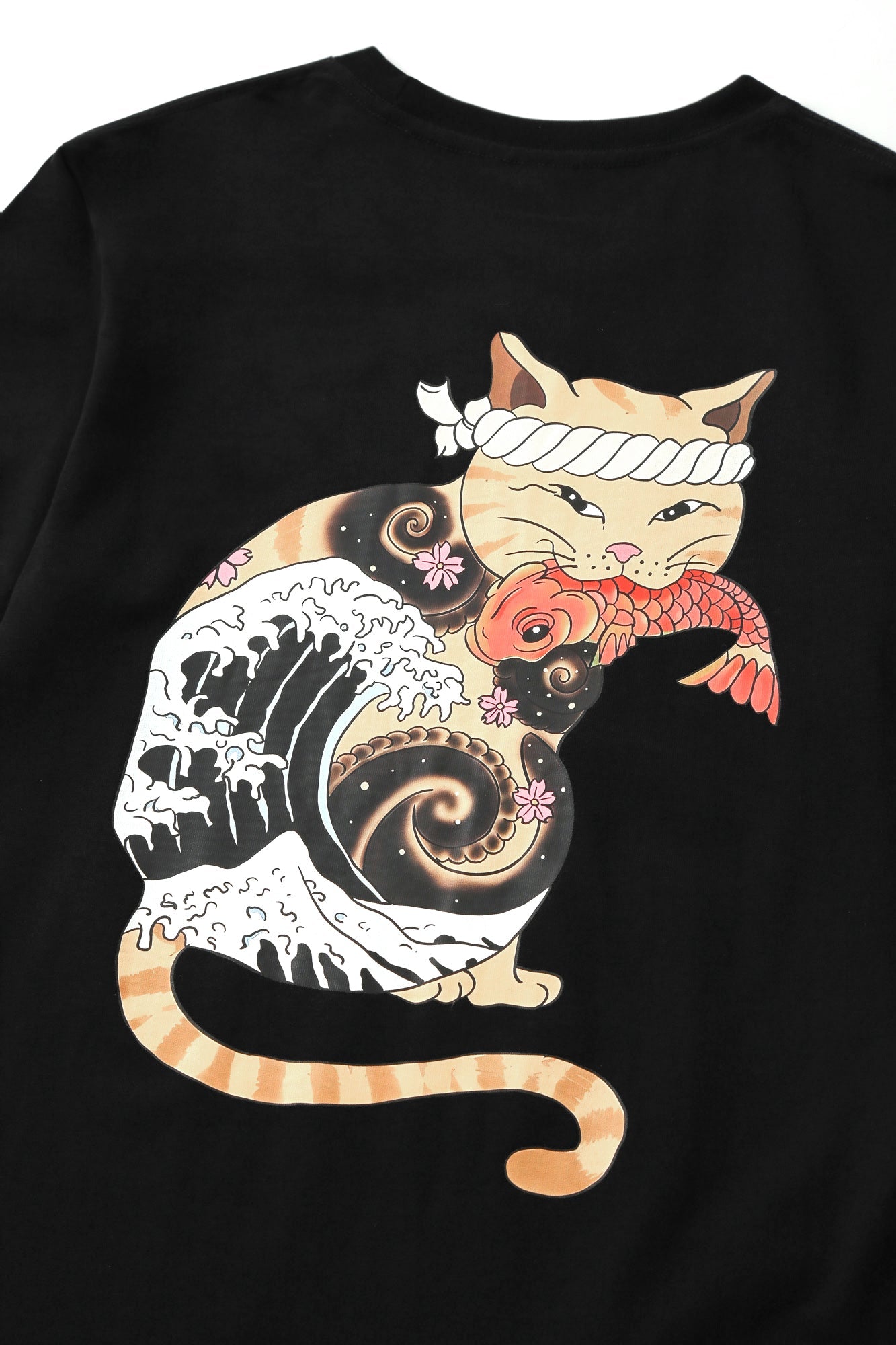 - The short sleeve t-shirt features a Japanese cat about to devour the koi, with a mixture of graphic art of waves and octopus legs to symbolize a Japanese mixed culture