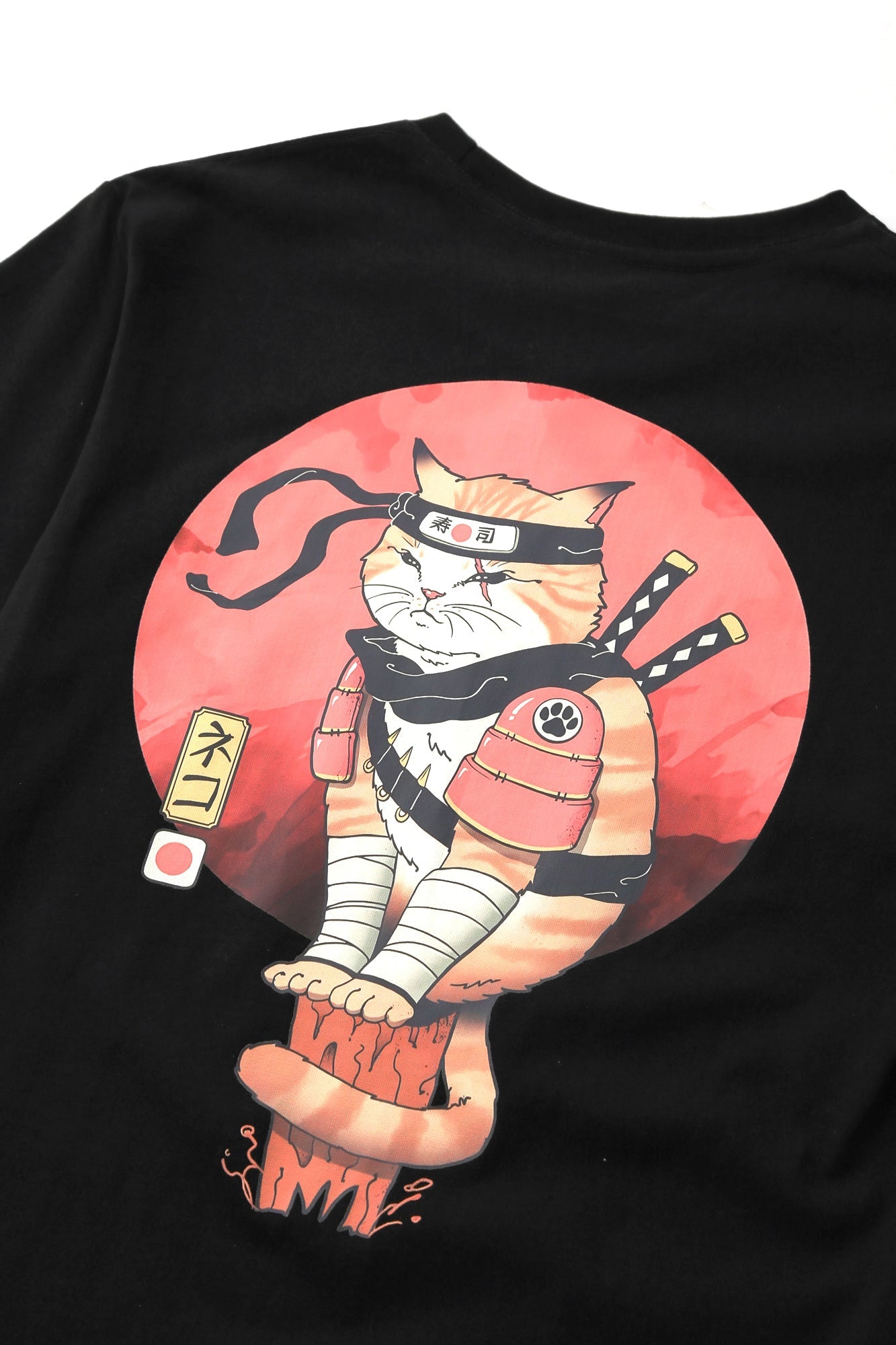 - The short sleeve t-shirt features a cat dressed as a Japanese ninja sitting on top of a high building scoping out its next prey
